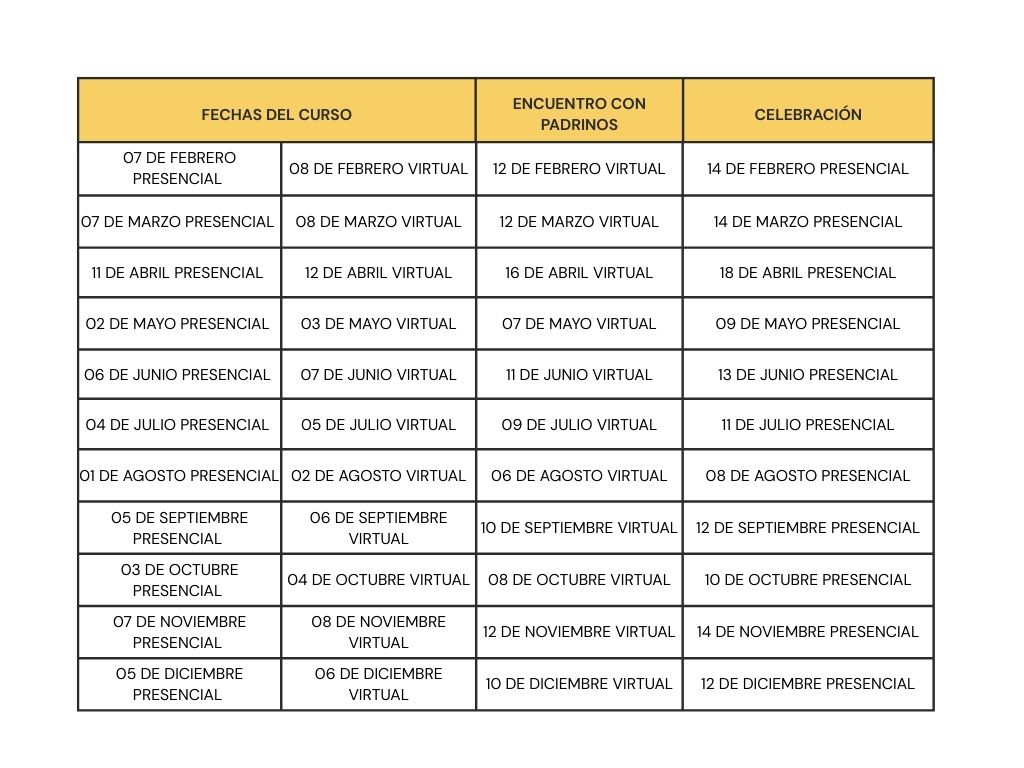 - La ceremonia es presencial el segundo sábado del mes hora: 2:00 pm en la Parroquia Santa María del Camino, Calle 138 No. 58 D - 35, el confirmado debe llegar a la 1:00pm y vestir de blanco.