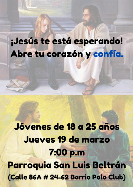 Noticias¡Jesús te está esperando!11 de Marzo de 2026Jóvenes de 18 a 25 años, jueves 19 de marzo hora: 7:00 pm.. En las instalaciones de la Parroquia. Like 0 Dislike 0