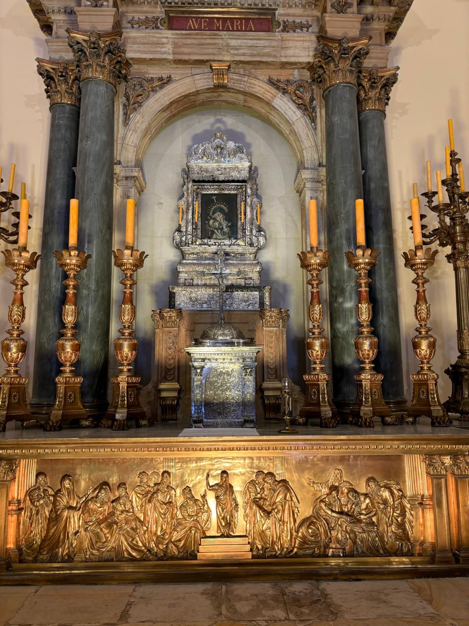 El actual retablo fue elaborado por los talleres parisinos de Poussielgue-Rusand, originalmente como Retablo Mayor, siendo estrenado el 1º de enero de 1901. Fue trasladado a este lugar en las reformas de 1968. Las cuatro columnas monolíticas son de mármol azul africano y pertenecieron a un palacio de Alejandría (en Egipto) derribado en 1890. El frontal de bronce dorado representa al Niño Jesús en medio de los doctores de la Ley. El Sagrario es obra del siglo XX del platero Jorge Martínez Gómez, sobre dibujos de Inés Acevedo Biester, quien se inspiró en el frontal del actual Altar Mayor.