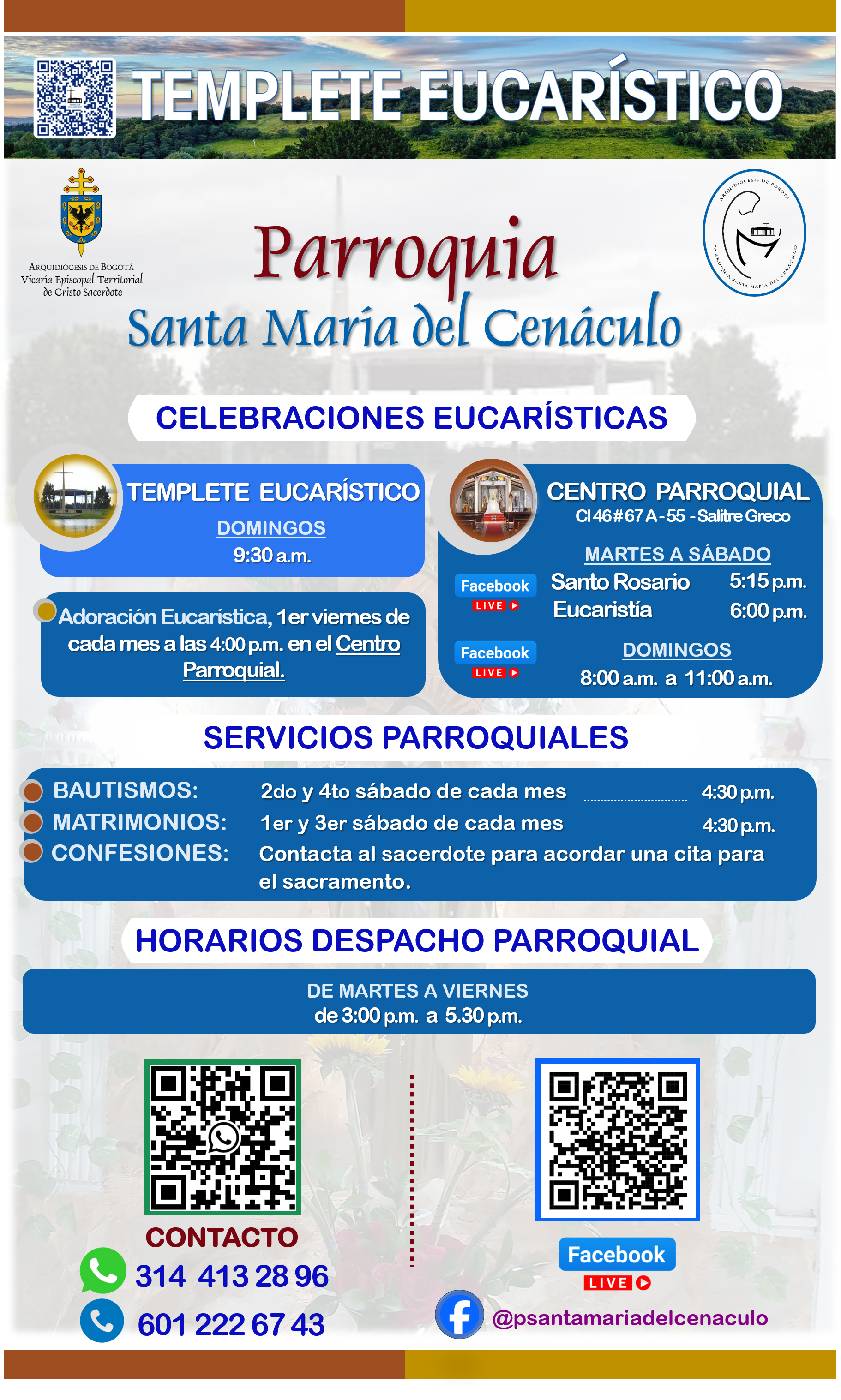 Servicios y HorariosLos domingos se celebra la Eucaristía en el Parque Simón Bolívar | Templete Eucarístico Eucaristía 9:30 a.m. Historia de la Primera Piedra1 de Octubre de 2025 Descripción del Templete4 de Julio de 2018 Visita Papa Pablo VI12 de Septiembre de 2017 Visita Papa Juan Pablo II25 de Octubre de 2016 Historia | Templete Eucarístico23 de Enero de 2016 Oraciones a la Virgen23 de Enero de 2016